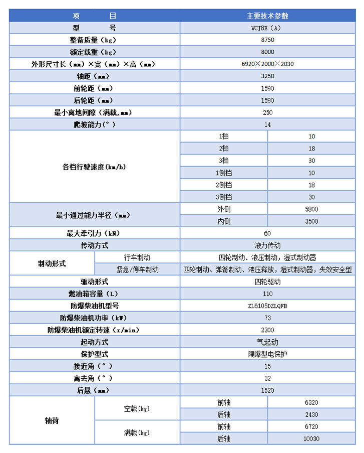 WCJ8E(A)防爆柴油機(jī)無軌膠輪車是山西偉鼎實(shí)業(yè)有限責(zé)任公司生產(chǎn)的防爆型產(chǎn)品。WCJ8E(A)防爆柴油機(jī)無軌膠輪車均采用焊接式前后機(jī)架、中央鉸接方式、液壓雙油缸轉(zhuǎn)向、前后鋼板彈簧懸掛,工作制動采用四輪制動、液壓制動、彈簧釋放,濕式制動器,緊急制動和停車制動采用彈簧制動,液壓釋放,濕式制動器。整車高度最低為2.03m,寬度為2 m,機(jī)身矮而且窄,適用于煤礦井下和矮型巷道物料和中小型設(shè)備的運(yùn)輸。由于具備自卸功能,對矸石和散裝物料尤為適用。 整車的轉(zhuǎn)彎半徑小,卸載性能好適用于井下運(yùn)行。裝用本公司自行研制的ZL6105DZLQFB型國三排放標(biāo)準(zhǔn)、氣起動防爆柴油機(jī)動力裝置,該機(jī)防爆可靠,動力性和低污染性能好。整車采用4×4全輪驅(qū)動,適應(yīng)于巷道惡劣路面使用。 整車結(jié)構(gòu)新穎、性能優(yōu)良、運(yùn)輸效率高,是大中型煤礦及有瓦斯和粉塵爆炸危險環(huán)境的輔助運(yùn)輸設(shè)備首選產(chǎn)品之一。 該車可選配加裝升降功能,舉升重量8T,舉升高度2米用于設(shè)備維護(hù)作業(yè),也可用于井下管道輔助安裝作業(yè)。 該車可選配智能防爆車載信息采集監(jiān)控主機(jī),實(shí)時提醒和報警并漢顯注釋及顯示故障碼;還可選配自動滅火裝置,行車記錄儀、倒車?yán)走_(dá)、倒車影像;還可選配礦用礦用車載視頻監(jiān)測裝置,具有行車記錄、車載影像、倒車?yán)走_(dá)、AI疲勞駕駛檢測、語音電話、無線通訊等功能,提高整車駕駛安全。