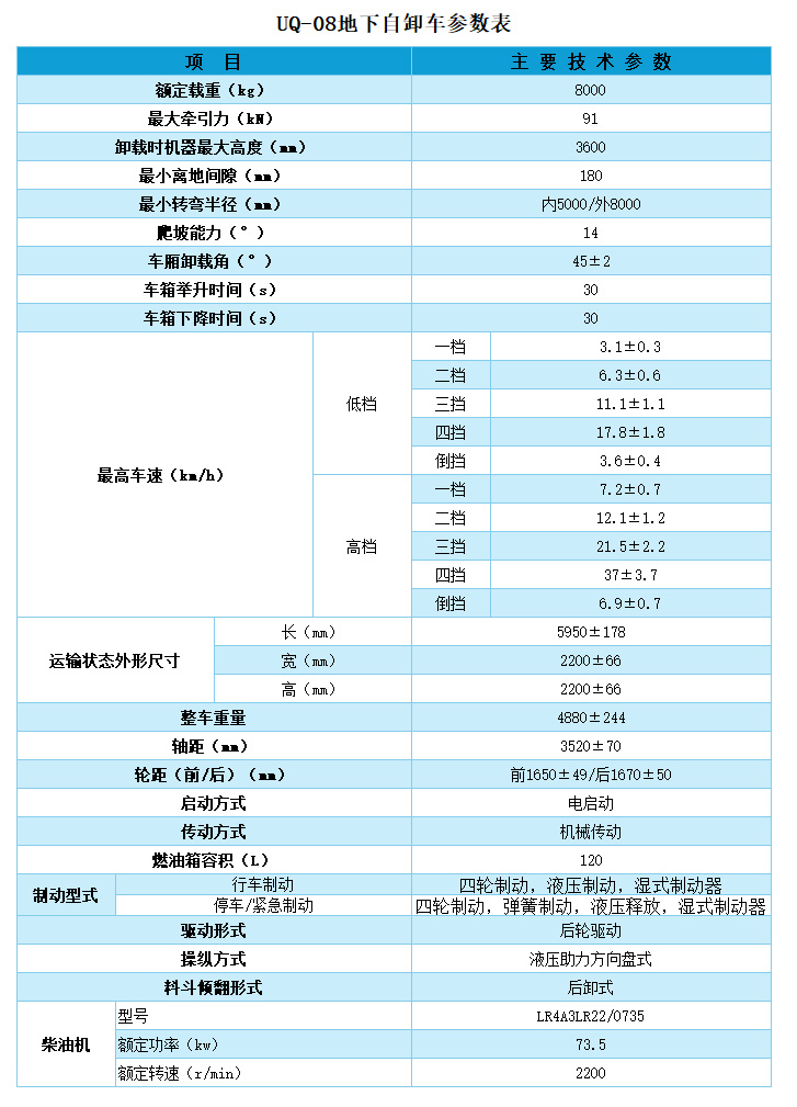 1 用途與特點(diǎn) 1.1該車是我公司研制的新一代自卸車,配套國Ⅲ排放標(biāo)準(zhǔn)、增壓中冷、電控高壓共軌噴射型式的東方紅LR4A3LR22/0735柴油機(jī),適合于煤礦井下運(yùn)輸,操縱方便,更安全可靠。 1.2該機(jī)具有以下特點(diǎn): 1.2.1該車性能國內(nèi)領(lǐng)先,輸出功率73.5kW,動(dòng)力強(qiáng)勁,特別適合于巷道井下運(yùn)輸和爬坡需要及惡劣環(huán)境作業(yè)。 1.2.2結(jié)構(gòu)緊湊,可靠牢固,適合于小斷面、窄巷道作業(yè)。 1.2.3制動(dòng)采用液壓雙回路(行駐一體)濕式制動(dòng)系統(tǒng),使工作更加可靠,因系統(tǒng)故障和制動(dòng)管路發(fā)生任何故障而失壓時(shí),制動(dòng)器均能自動(dòng)實(shí)現(xiàn)制動(dòng),確保車輛的安全。 1.2.4主要原材料和零部件采用國內(nèi)知名企業(yè)生產(chǎn),質(zhì)量保證。 2 使用環(huán)境條件 2.1自卸車能在周圍環(huán)境溫度-20℃~+40℃條件下使用。 2.2自卸車能在海拔高度不超過1200m的地區(qū)使用。 2.3自卸車能在濕度不超過95%(+25℃)的環(huán)境中正常使用。